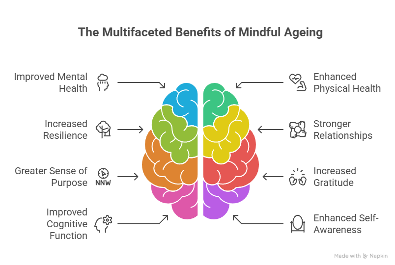 Many people discover new passions and deeper friendships as they age, especially when they approach life with an open mind. Mindful ageing promotes healthy routines, like balanced eating, regular movement, and connecting with others, while also learning to pause during stressful times and find moments of calm. It’s a journey towards living more meaningfully, where each day brings a chance to grow, to laugh, and to be grateful—no matter our age.