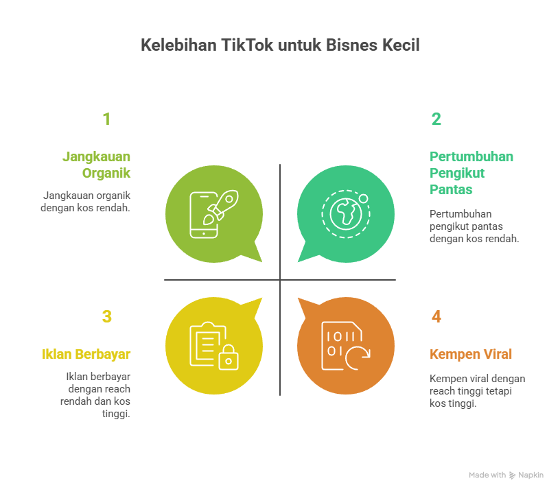 Berbeza dengan Facebook atau Instagram yang semakin saturated, TikTok masih ada ruang besar untuk bisnes kecil berkembang. Antara kelebihan TikTok: